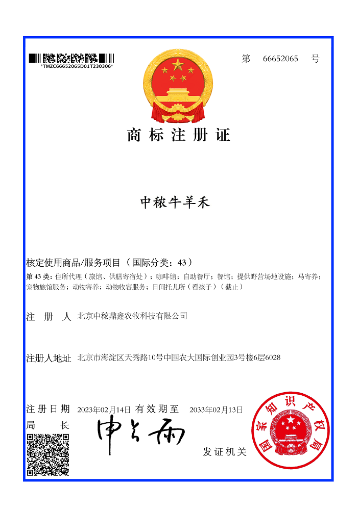 中秾牛羊禾43類商標注冊證書